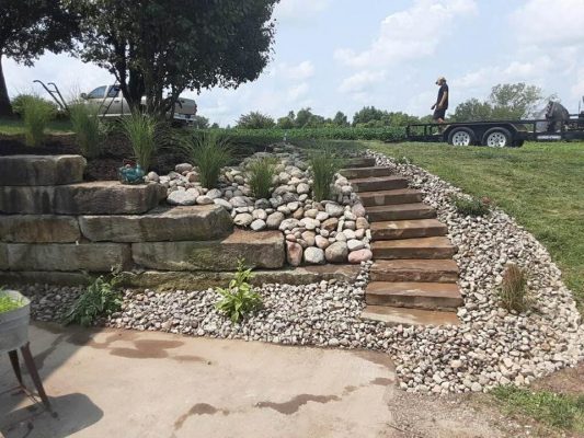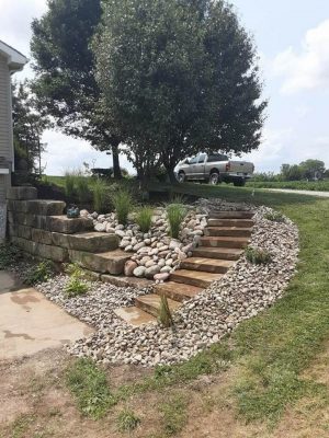This custom landscape design incorporates cool natural snapped stone steps with bedding areas. A variety of plants and grasses accent the stones and steps. This landscape design will not only enhance the beauty of this great property, but also help control erosion.