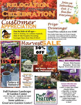 Full Features Landscape & Garden Center is hosting a Relocation & Customer Appreciation Celebration – along with a Harvest Sale!  We hope you’ll join us – we have something fun for all ages, and great sale prices!  See all the details below.