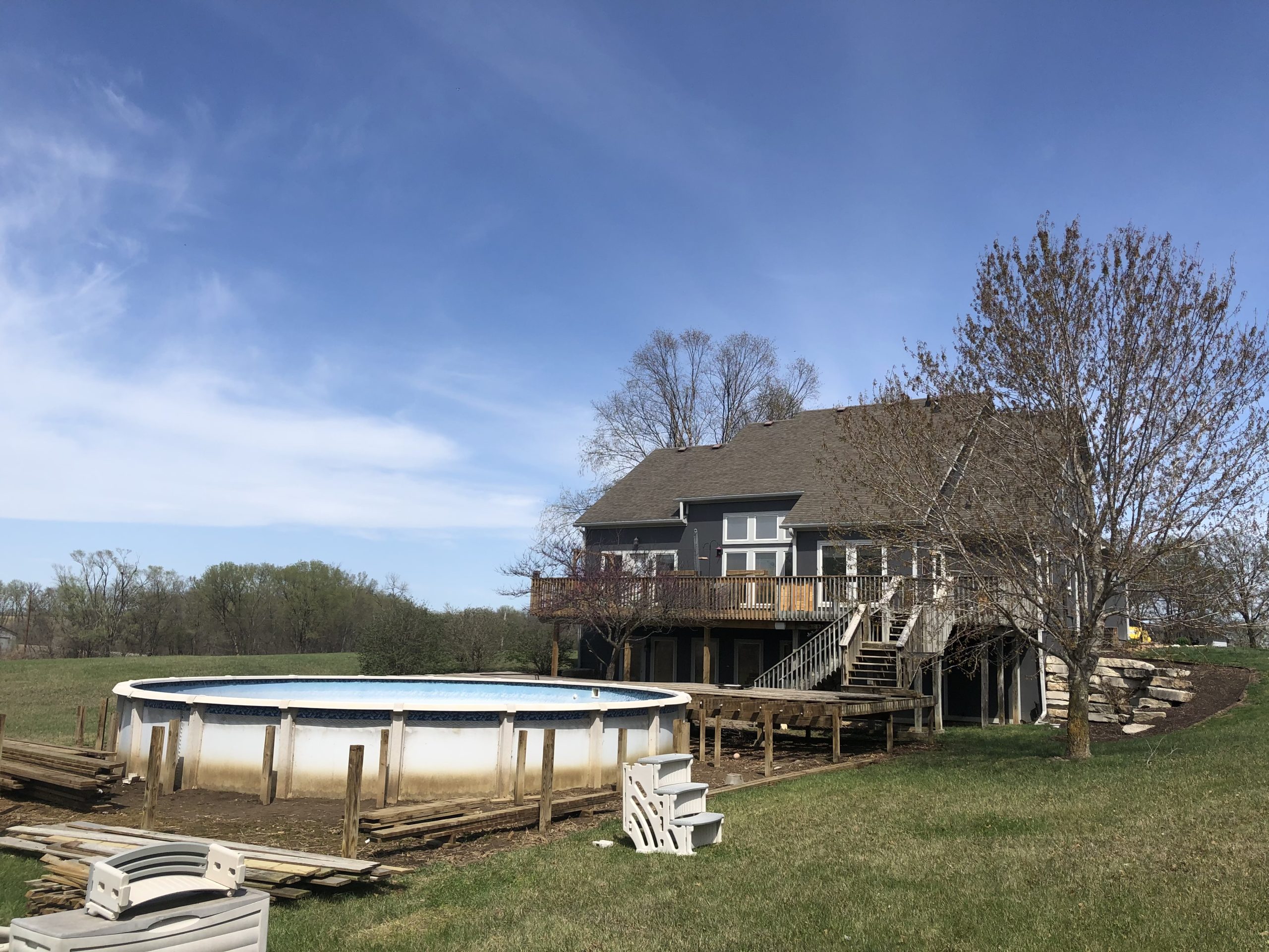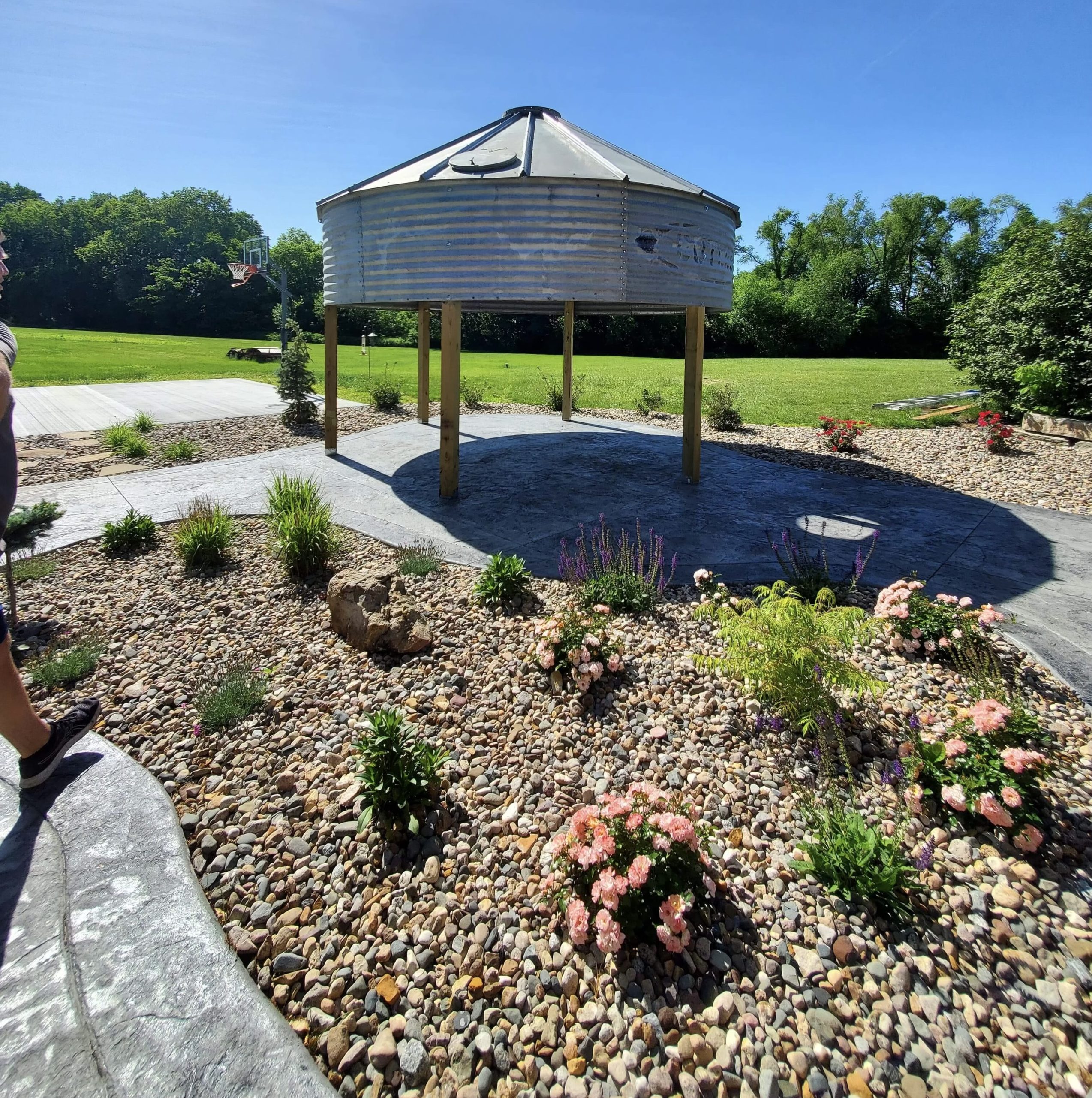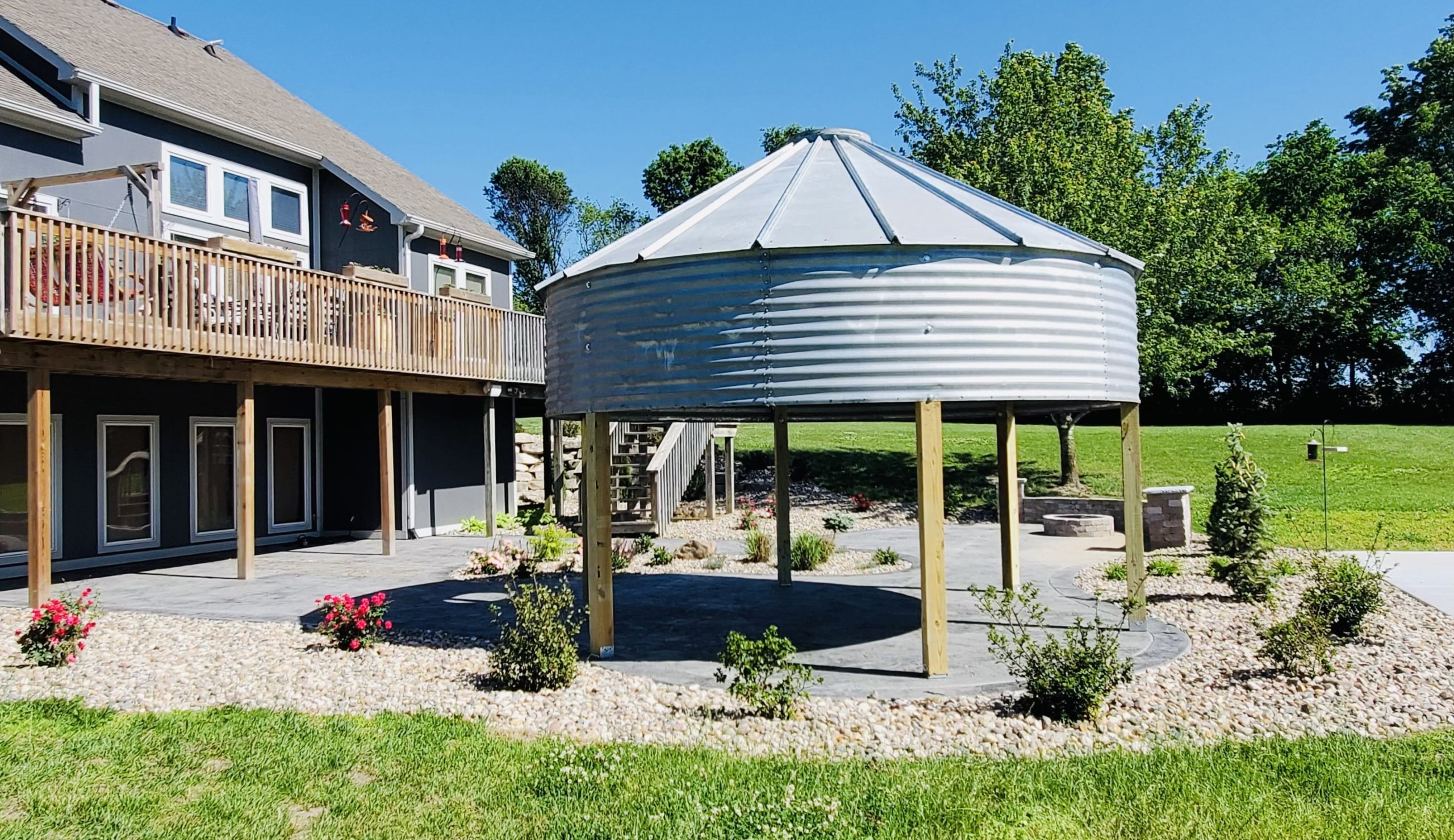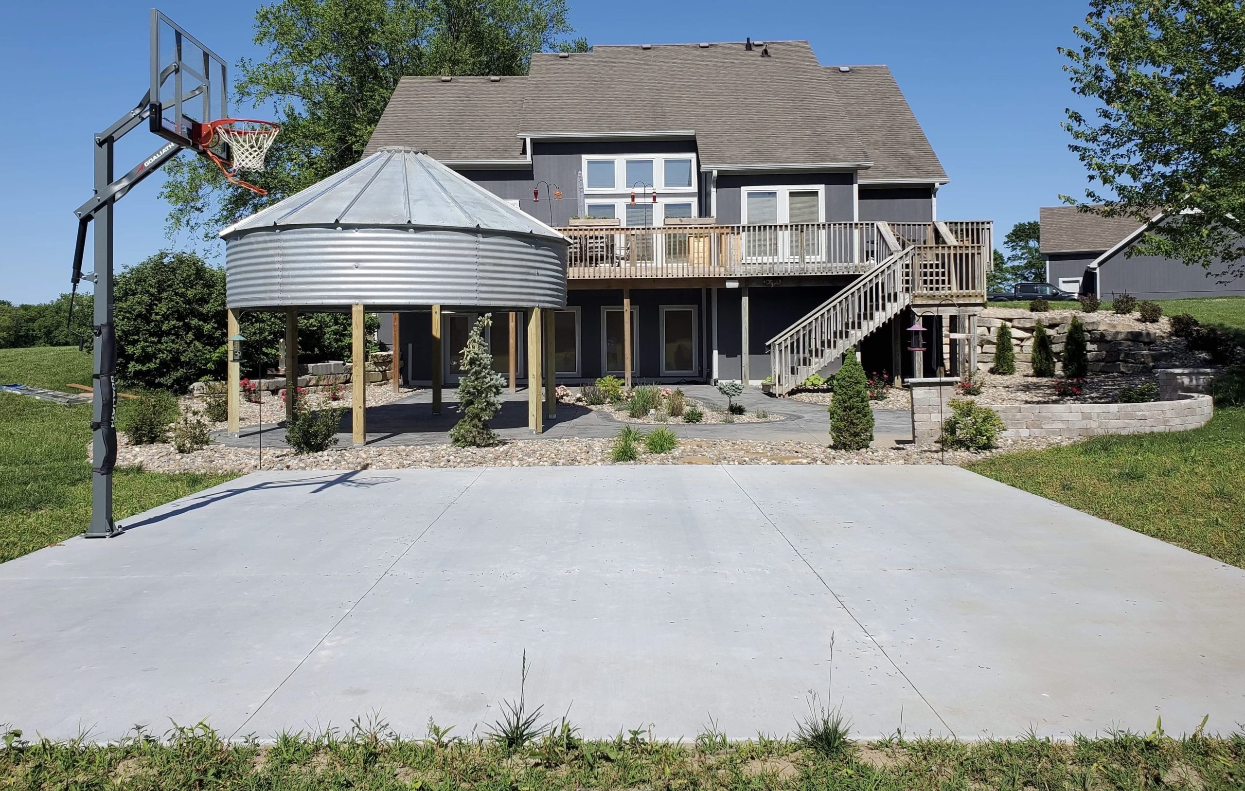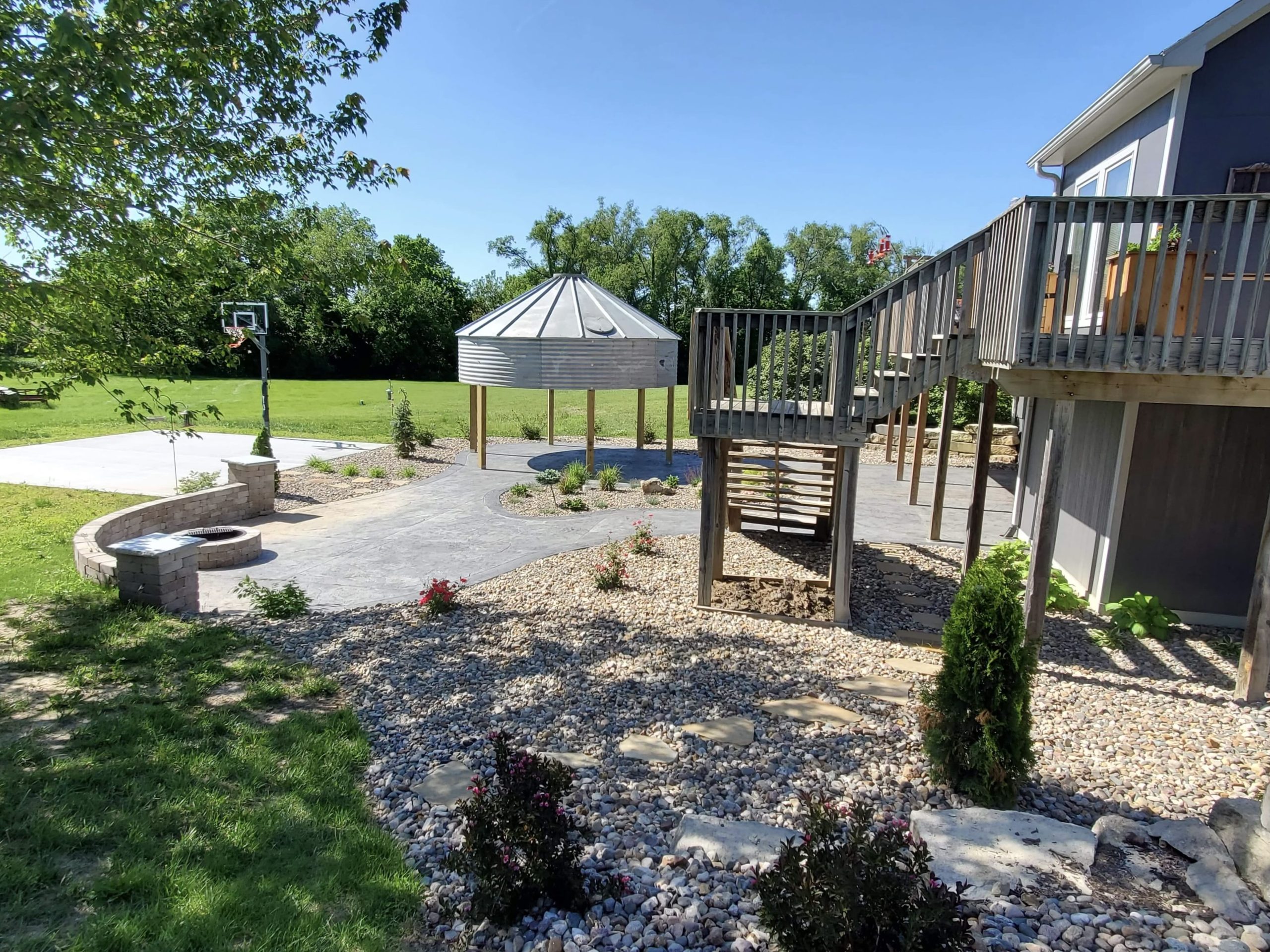 Before photo of Custom landscape project with gazebo made from top of corn silo. Gray house with white trim in the background. Various plants and trees in rocky areas surrounding the patio and steps.